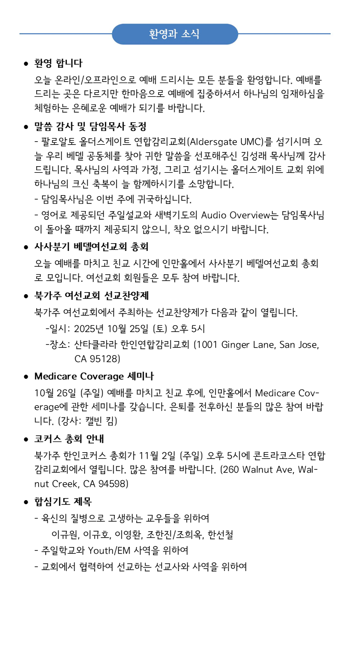 2025년 10월 19일 교회 소식