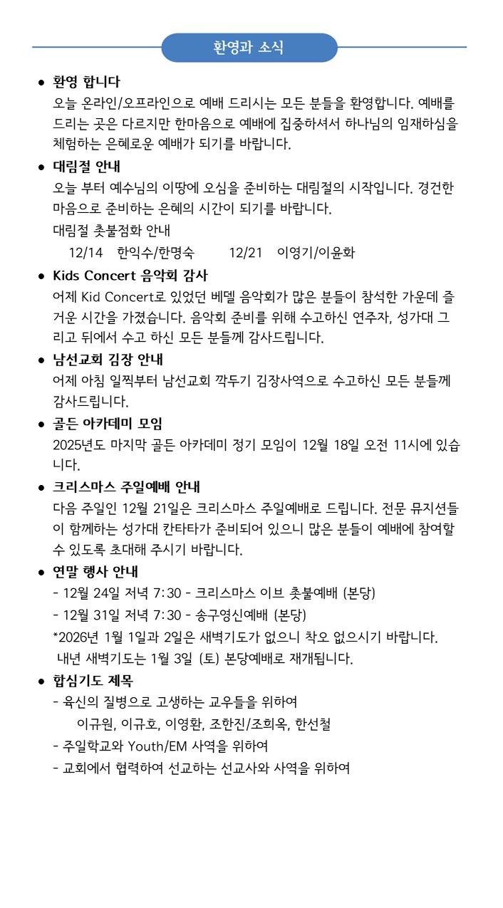 2025년 12월 14일 교회 소식