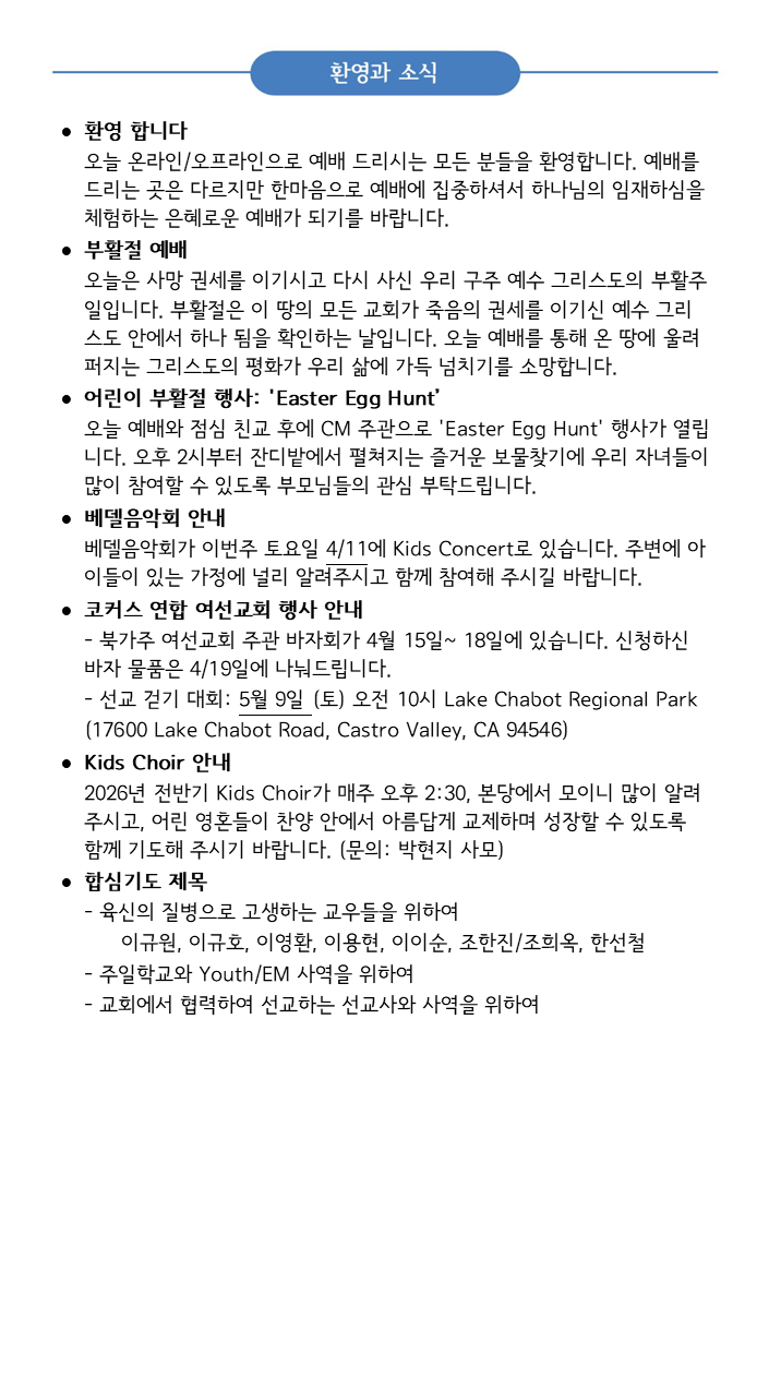 2026년 4월 5일 교회 소식