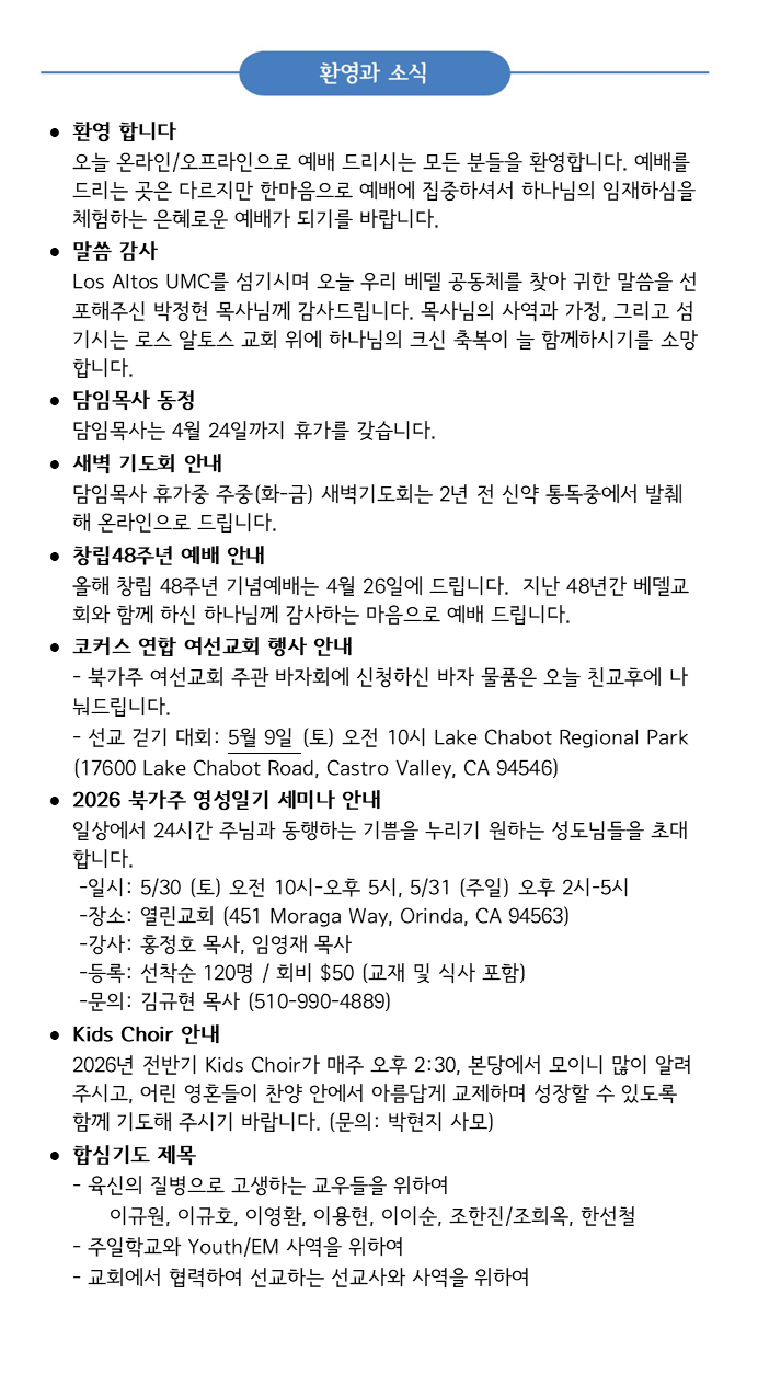 2026년 4월 19일 교회 소식